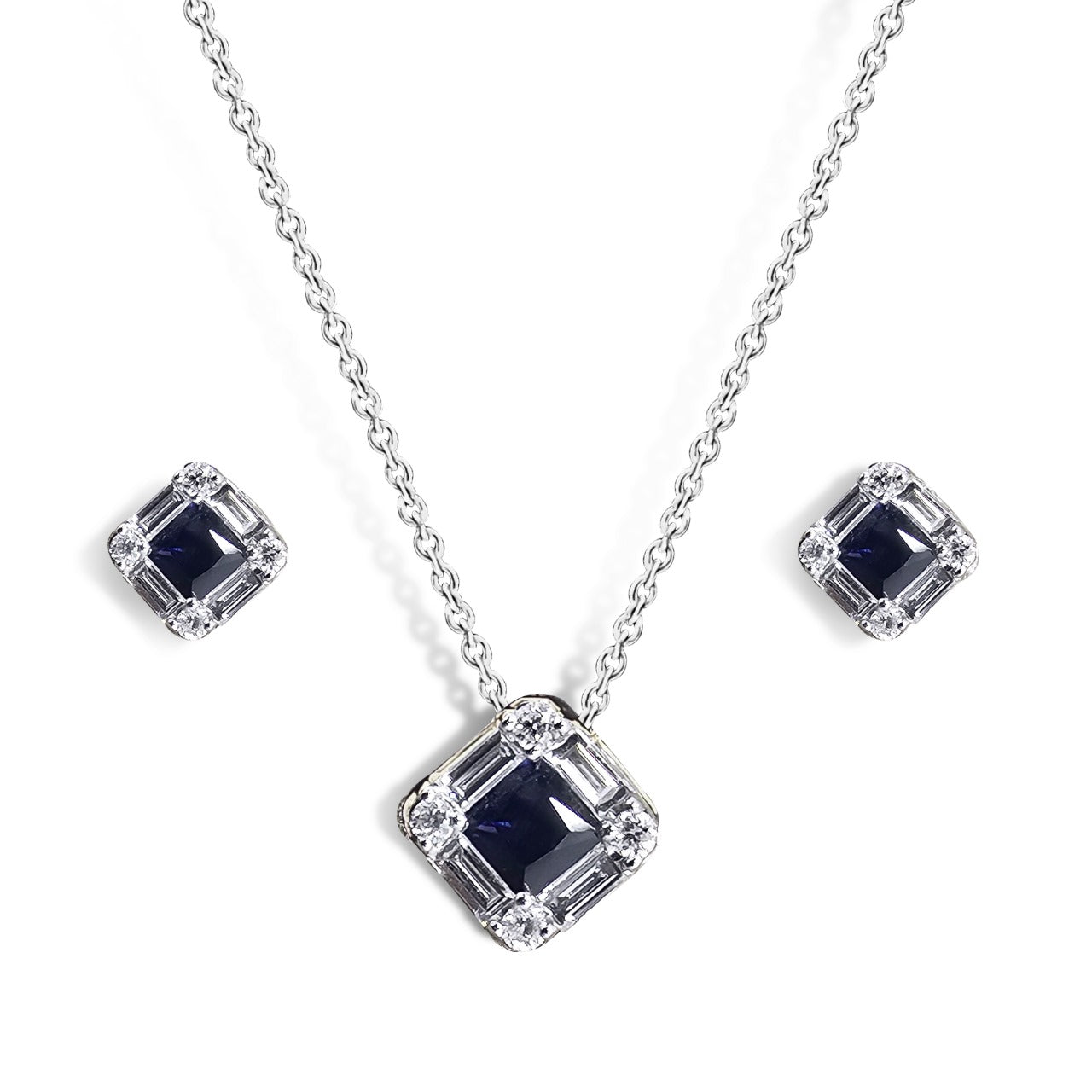 0.46ct Sapphire and Diamond Baguette Halo Pendant and Earring in 9ct White Gold Set