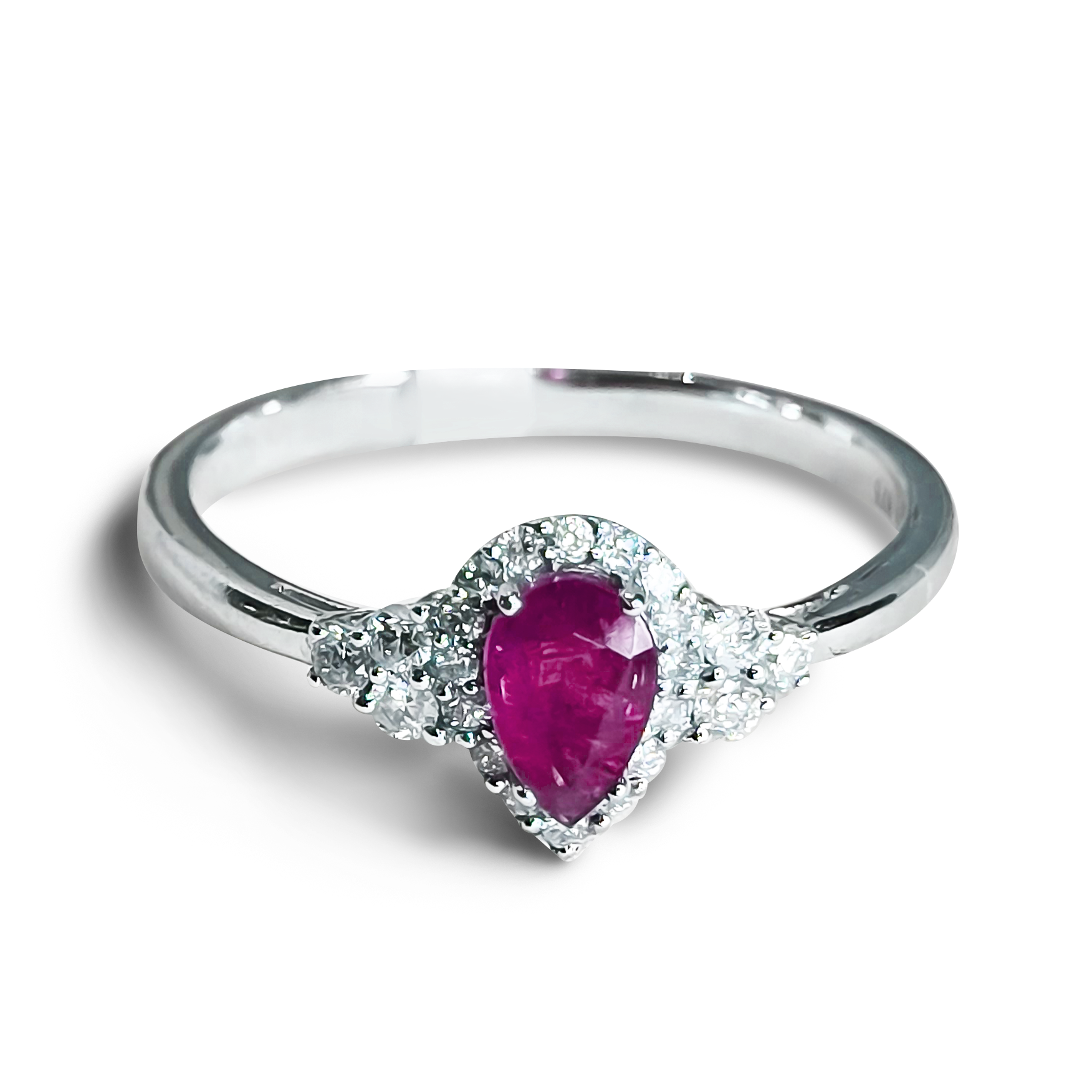 AA Color, Eye-Clean Ruby Teardrop Cut in a Diamonds Halo set in Wedding Band Ring of gleaming 9ct White Gold. This almost eternal classic design features a sparkling diamonds, perfect for celebrating your love story.