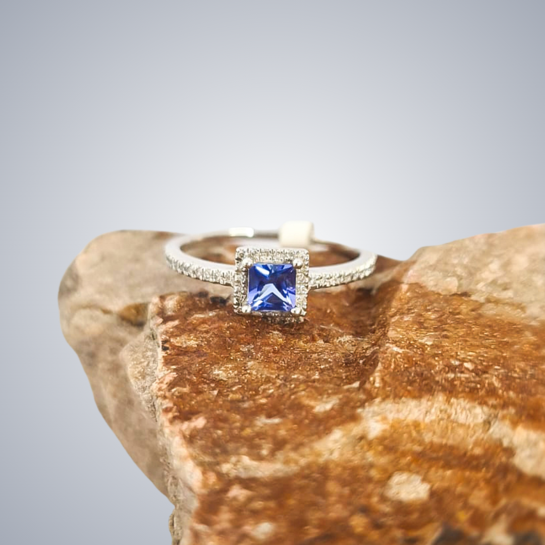 0.39ct Tanzanite Princess Cut with Diamond Halo Ring in 9ct White Gold