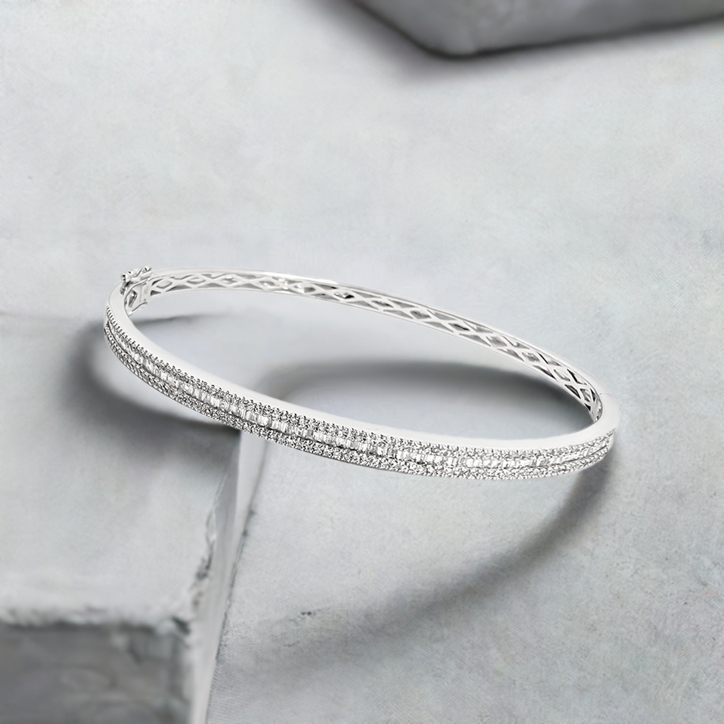 Elevate your wrist with this stunning Diamond bracelet. Crafted in luxurious 9ct white, this Diamond bangle features multiple rows of Diamonds touch of modern elegance. Perfect for everyday wear or adding a touch of shimmer to your evening look. Secured with a secure lobster clasp for peace of mind.
