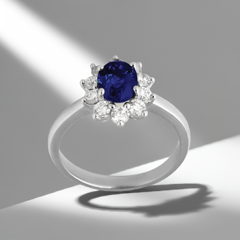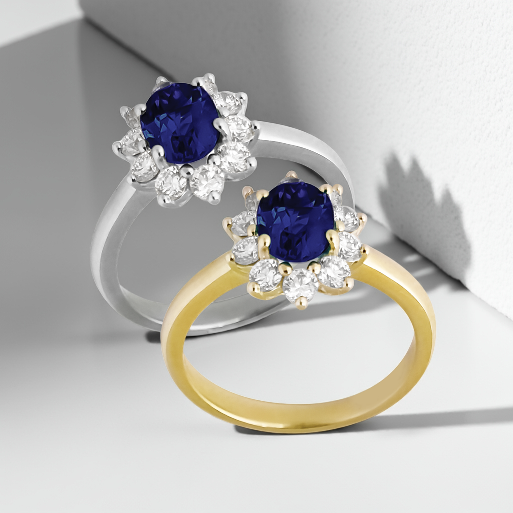 D-E Color, VS1 Clarity Lab-Grown Brilliant Cut Diamonds set in a Halo around a Breathtaking Lab Grown Certified Sapphire exotic Wedding ring set in gleaming 9ct Gold. This classic design features a sparkling diamonds, perfect for celebrating your love story or birthday. Customize with a wedding band and resizing available. Shop now!