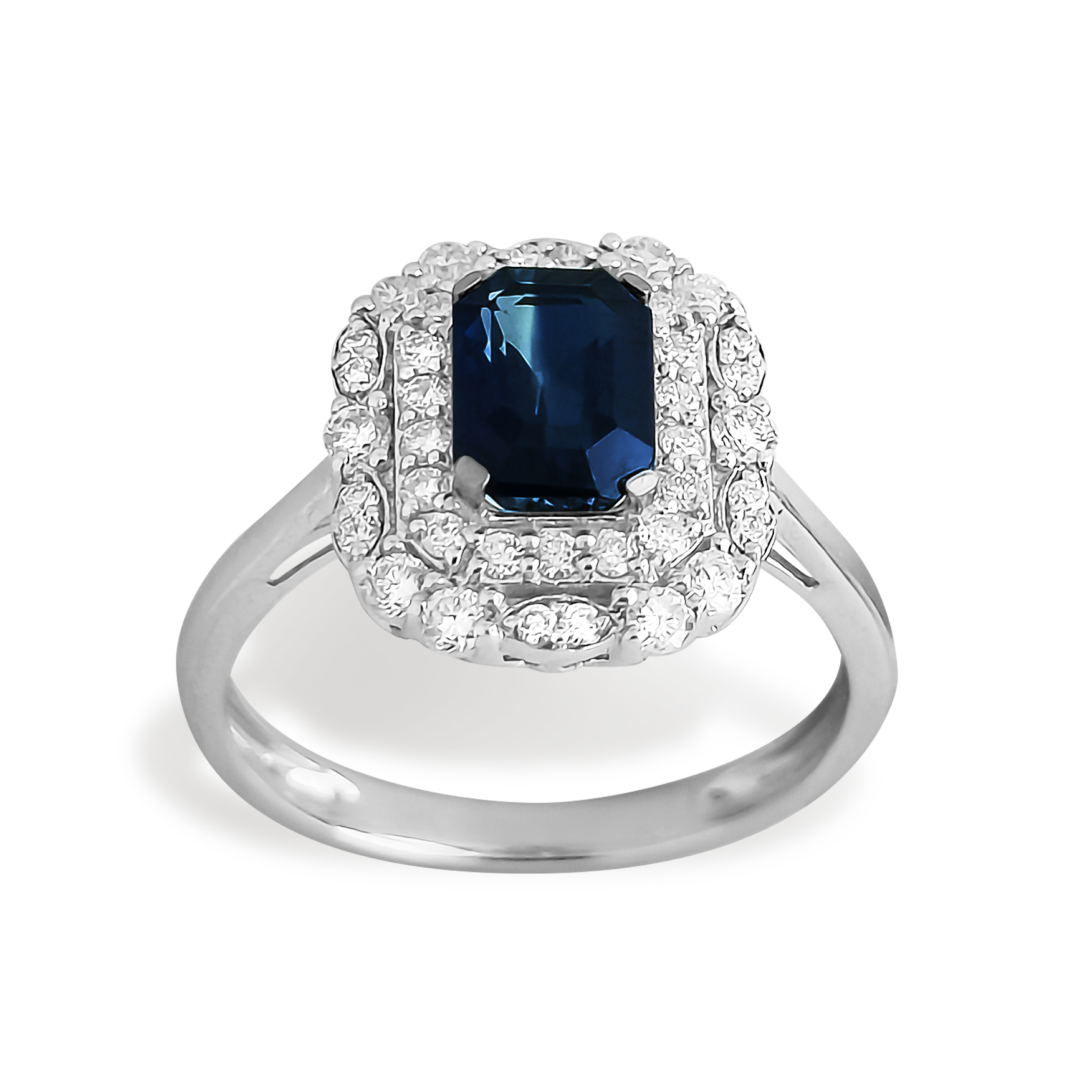 1.10ct Emerald cut Sapphire and Double Diamond Halo Ring in 9ct White Gold
