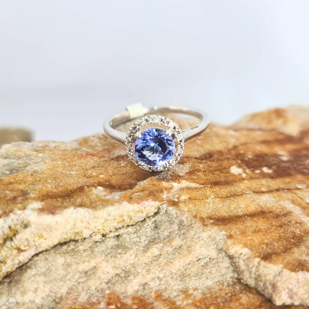 1.10ct Tanzanite and Diamond Halo Ring in 9ct White Gold