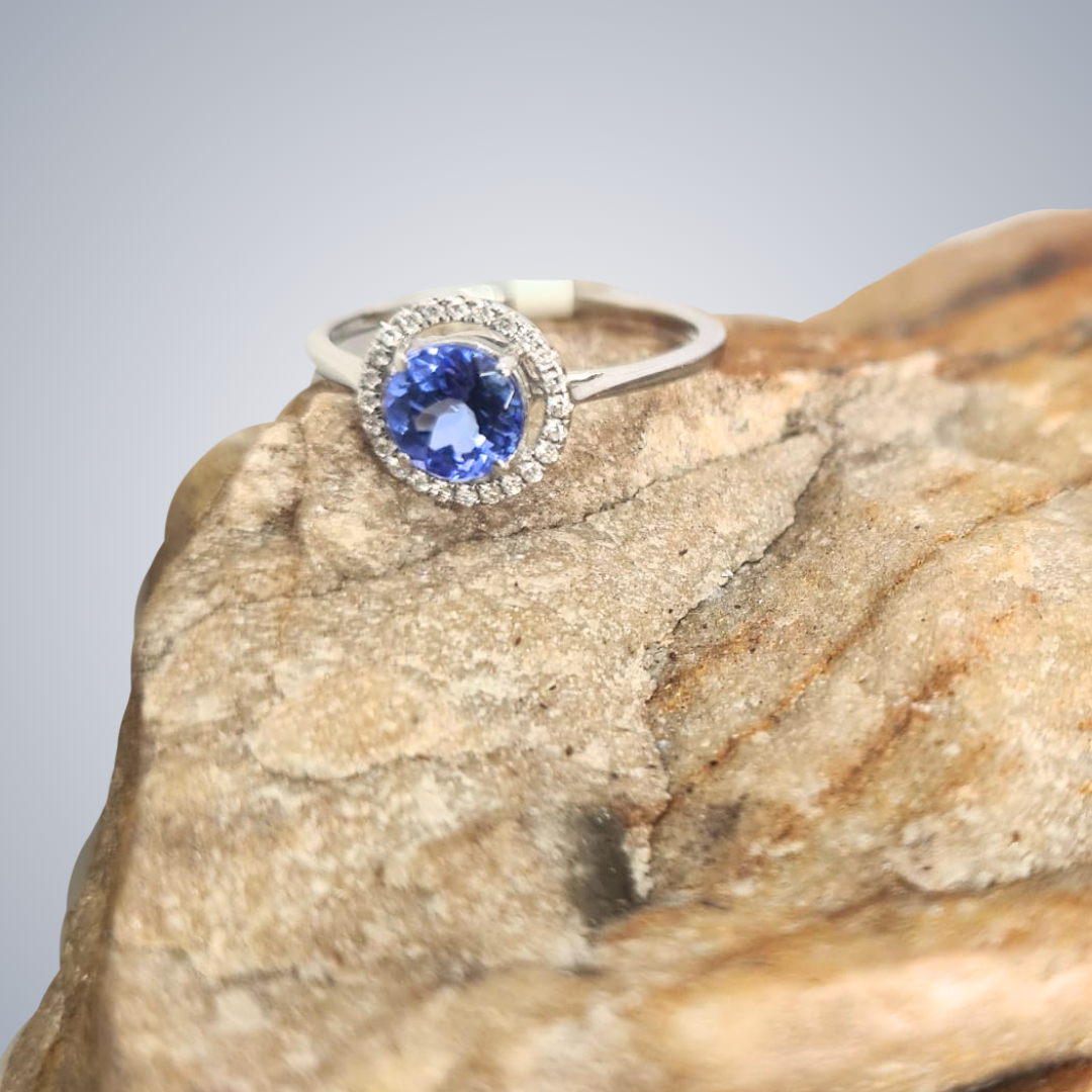 0.87ct Tanzanite and Diamond Halo Ring in 14ct White Gold