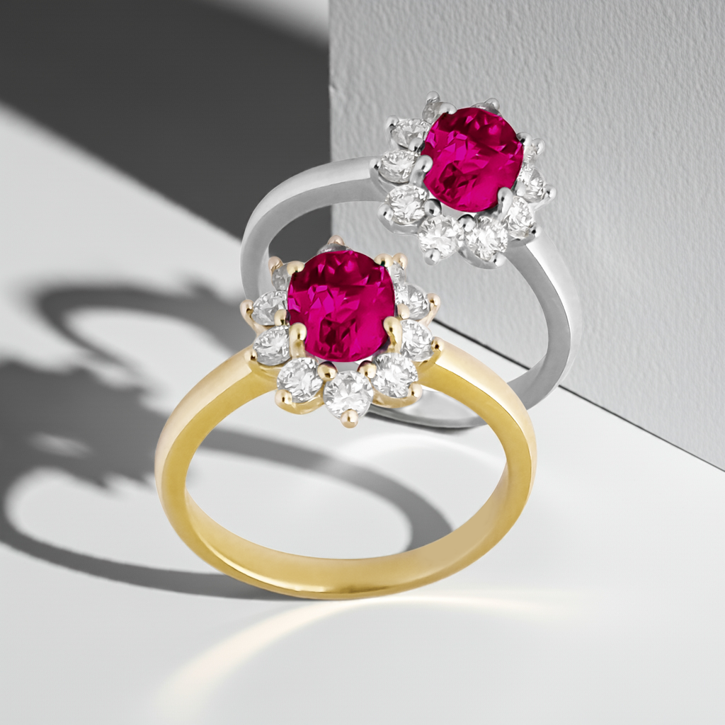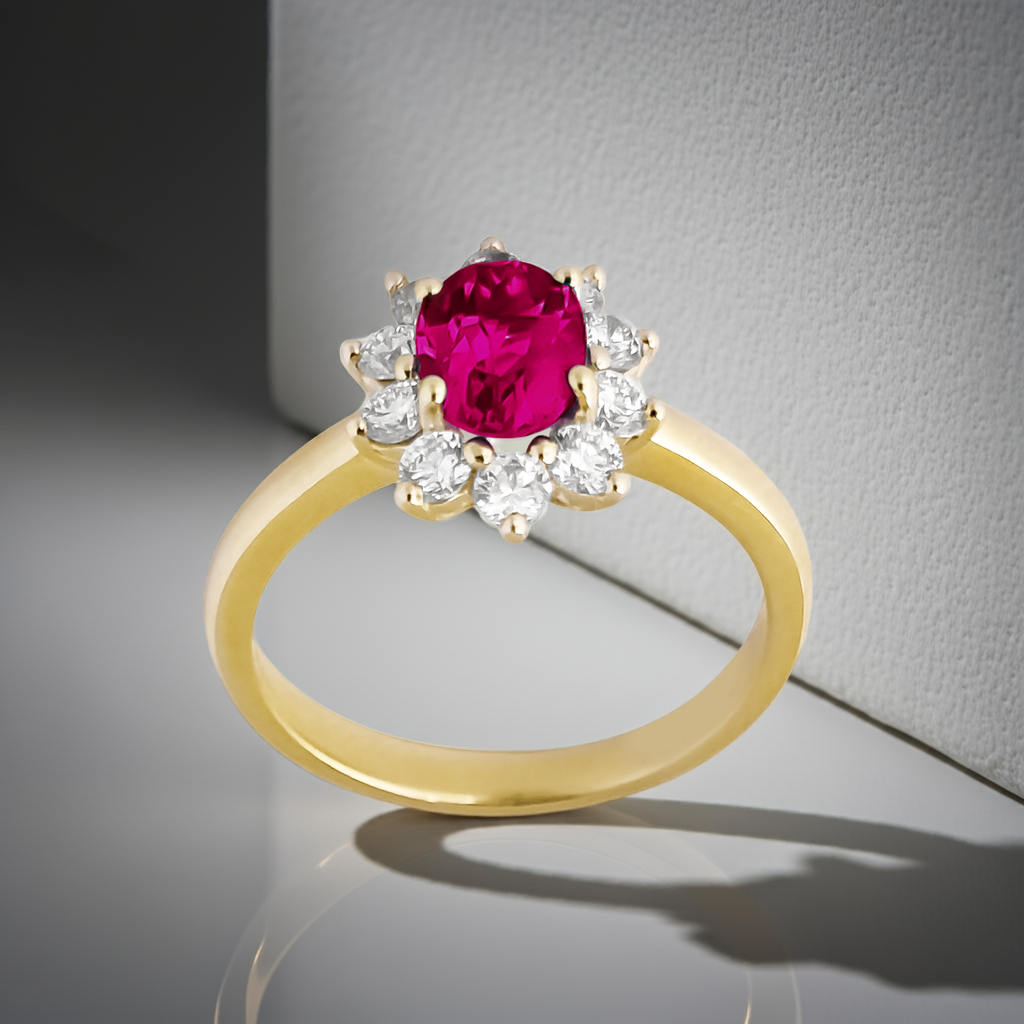 D-E Color, VS1 Clarity Lab-Grown Brilliant Cut Diamonds set in a Halo around a Blistering Lab Grown Certified Ruby exotic Wedding ring set in gleaming 9ct Gold. This classic design features a sparkling diamonds, perfect for celebrating your love story or birthday. Customize with a wedding band and resizing available. Shop now!