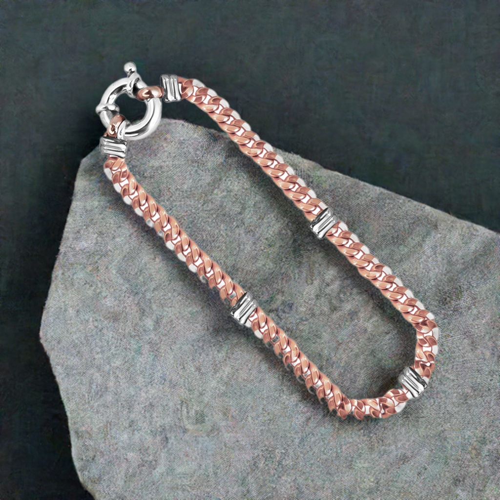 9ct Rose & White Gold Curb Link Bracelet (19cm). This beautiful 19cm curb link bracelet, crafted from 9ct rose and white gold, is the perfect accessory for any occasion. The delicate, alternating links create a modern and sophisticated look, while the secure Signoretti clasp ensures peace of mind. Treat yourself or surprise a loved one with this timeless piece.