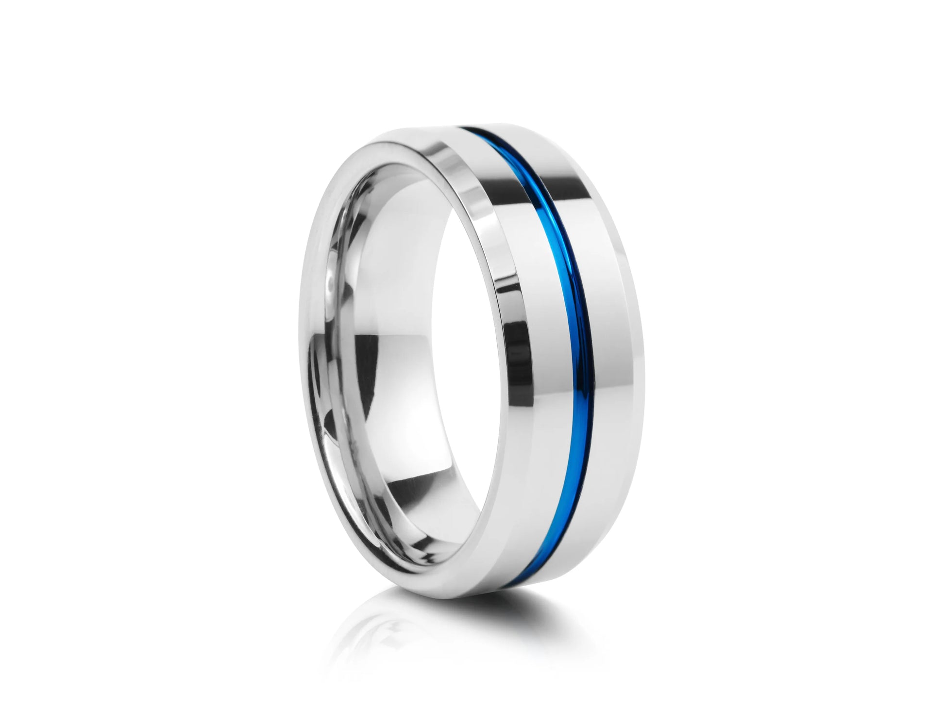 8mm Tungsten Ring - Silver with Blue Groove Center