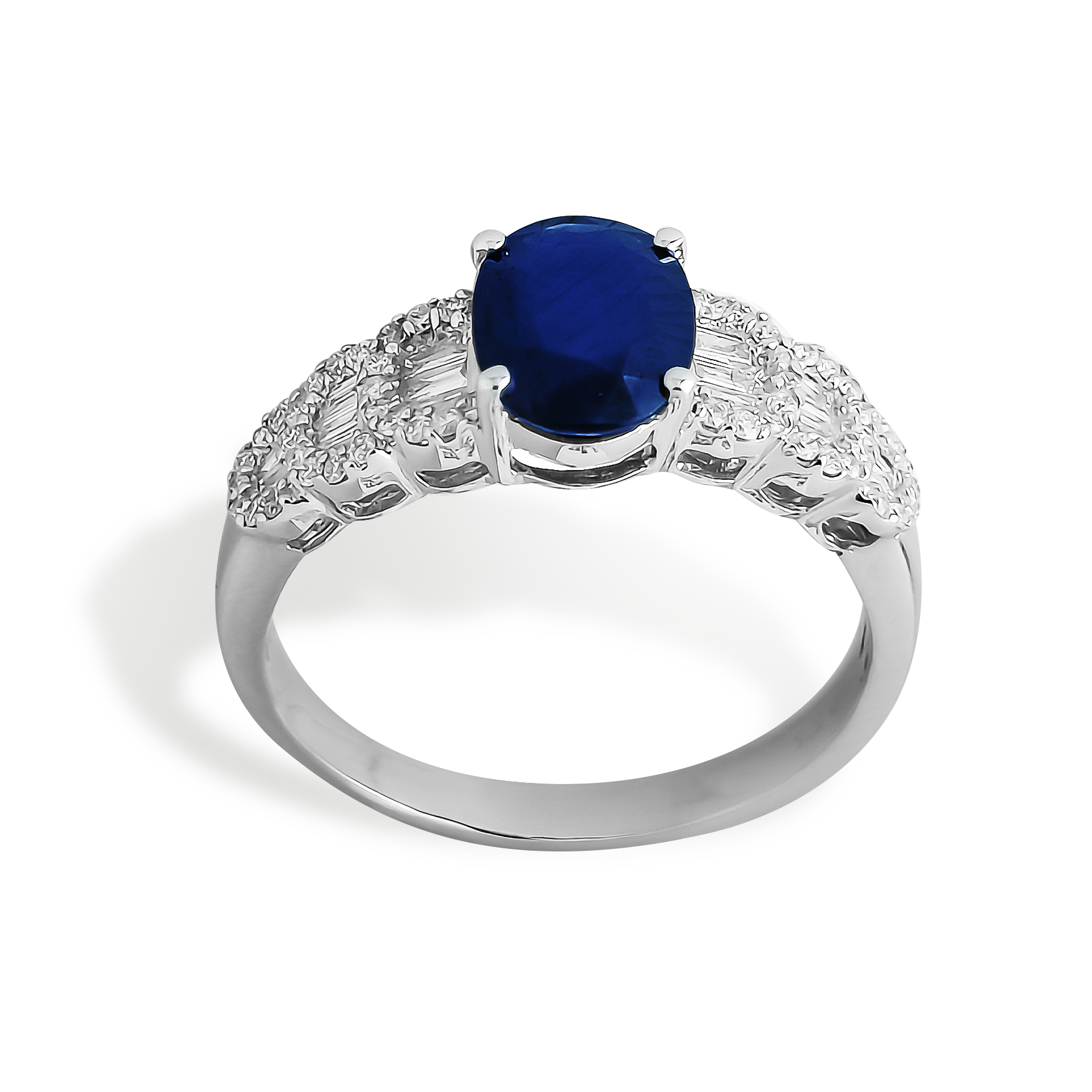 Oval Sapphire Center and Tapered Baguette Diamond Halo Ring in 9ct White Gold.
