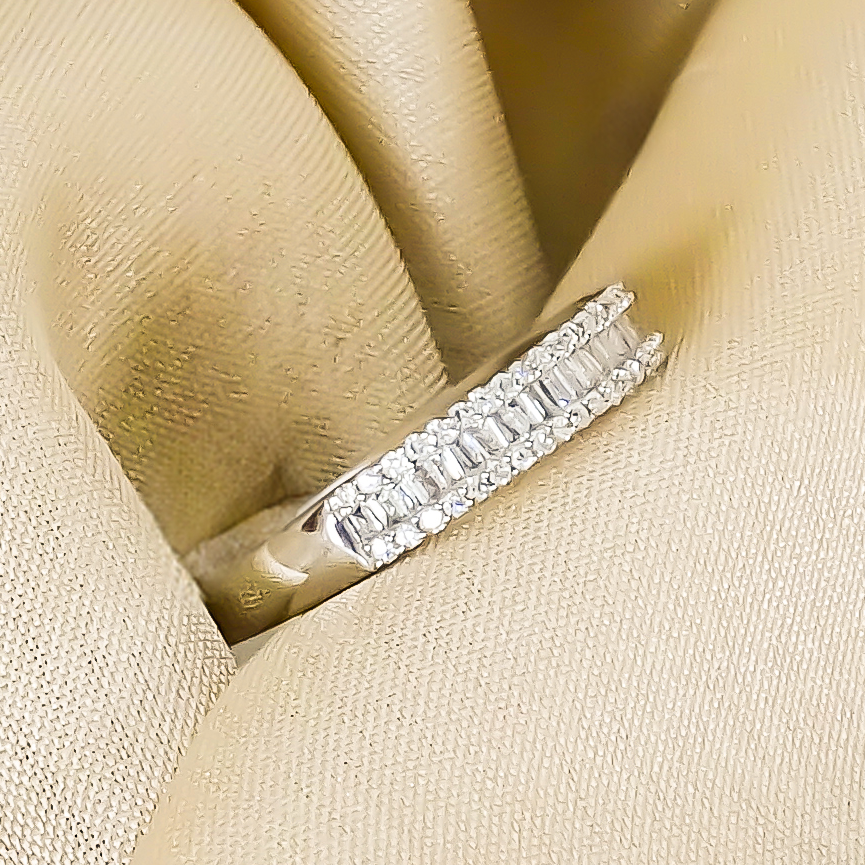 Diamond Baguette Center Half Eternity With Duo Claw Set Half Eternity on our sides in 9ct White Gold. A perfect Stack Ring or Wedding Band.
