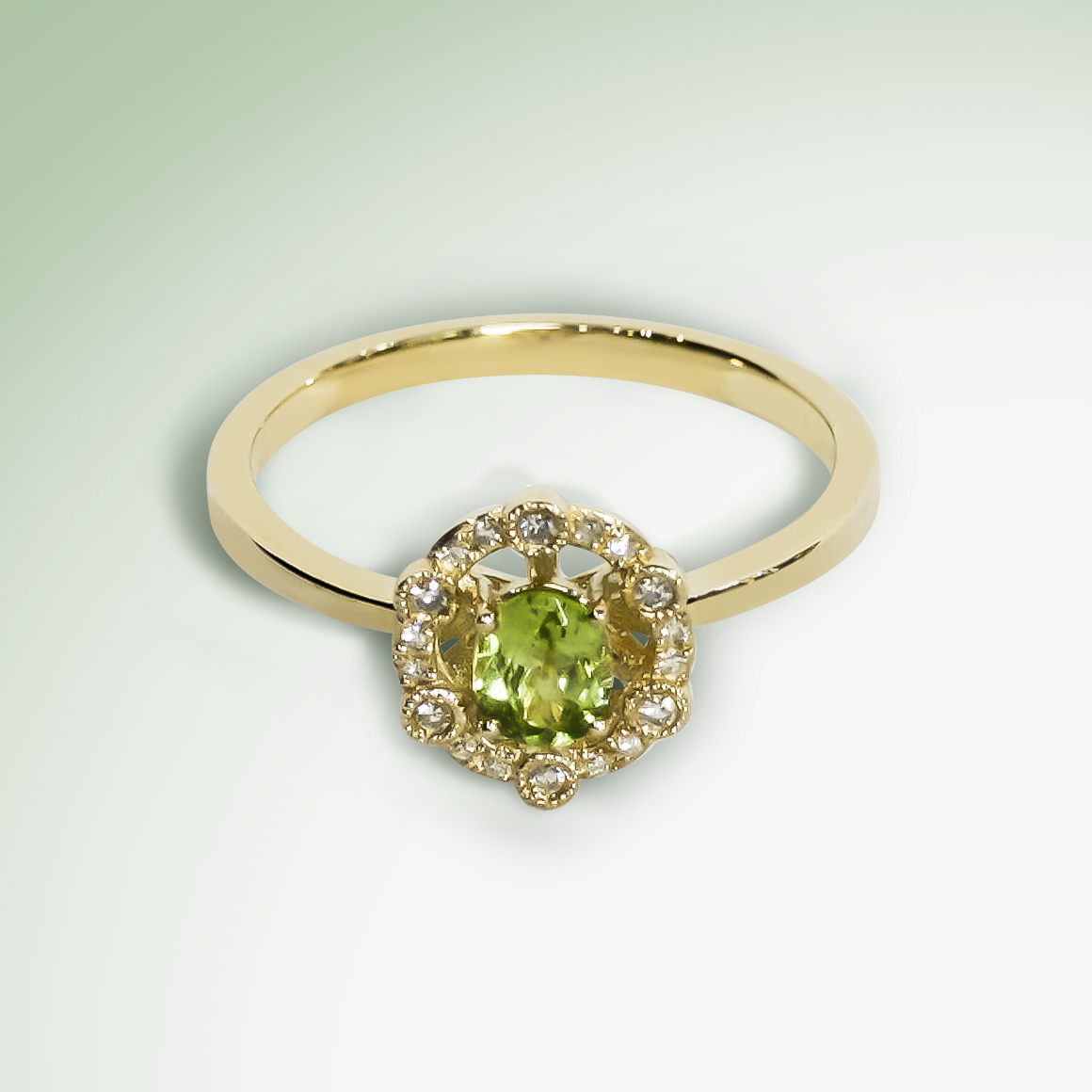 Classical Design Oval Peridot Outer Halo Ring in 9ct Yellow Gold