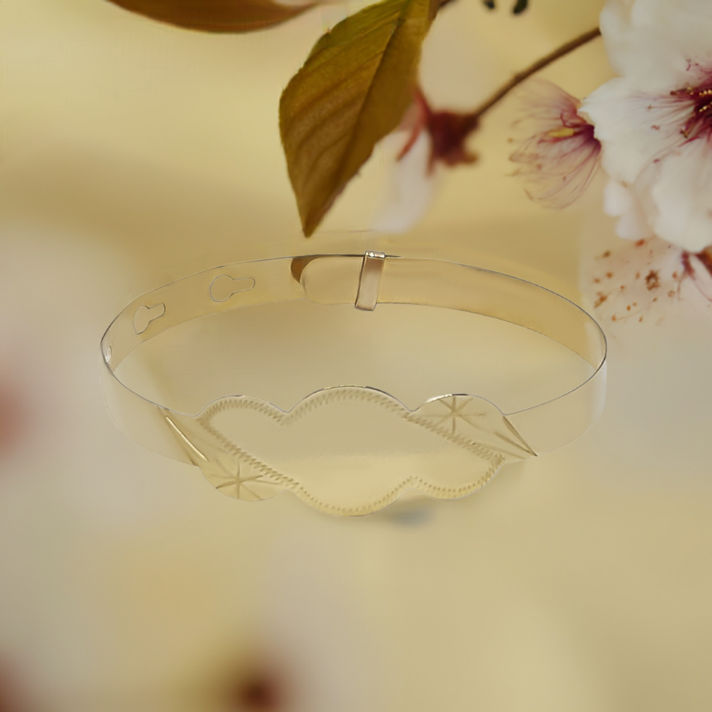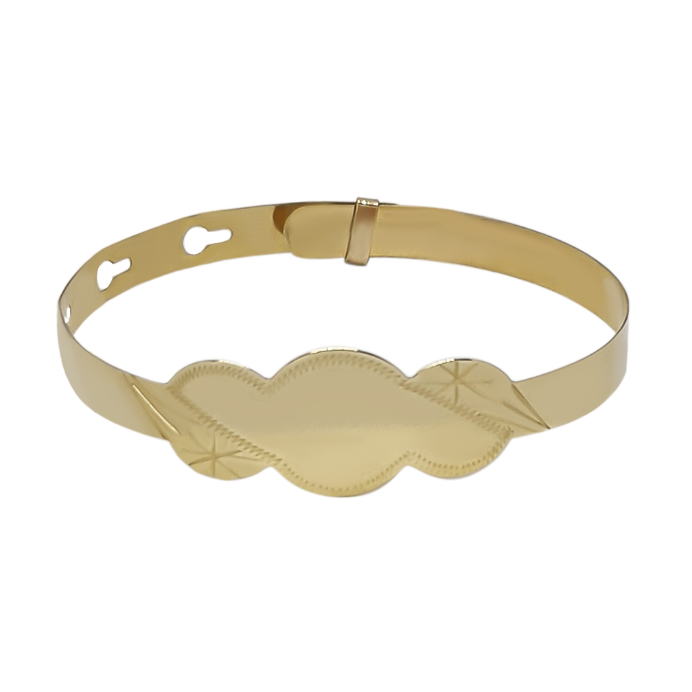 Give your little one a precious keepsake with our Children's Multi-Size Star Shield Shape Panel Bangle Bracelet in 9ct Gold. This charming bangle is designed with safety and comfort in mind, featuring an adjustable mechanism to fit growing wrists. Crafted in durable 9ct gold, the adorable star shield panel adds a delightful touch. A perfect gift for birthdays, christenings, or special occasions.