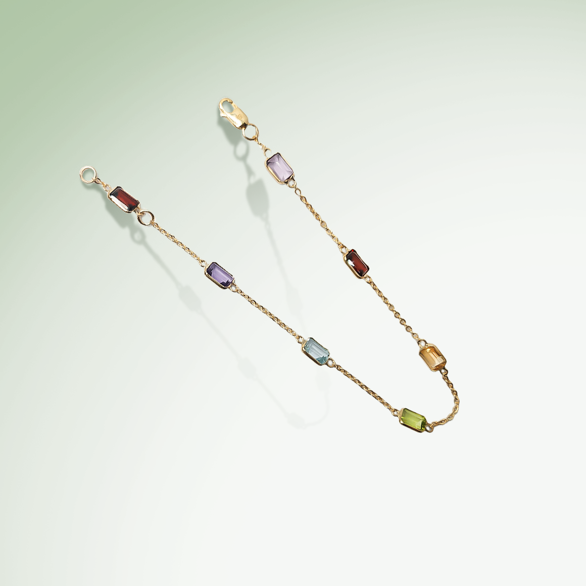 Amazing Natural Semi-Precious Gemstone Tutti Frutti in a Radiant Cut Bracelet in 9ct Yellow Gold, 1 x Amethyst, Citrine, Topaz, Peridot, Garnet.